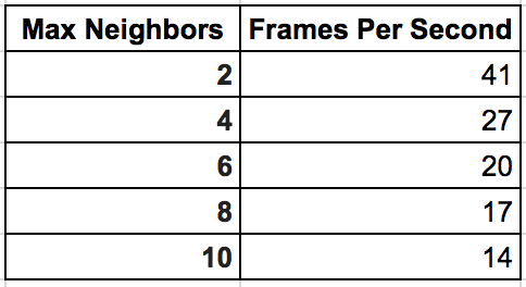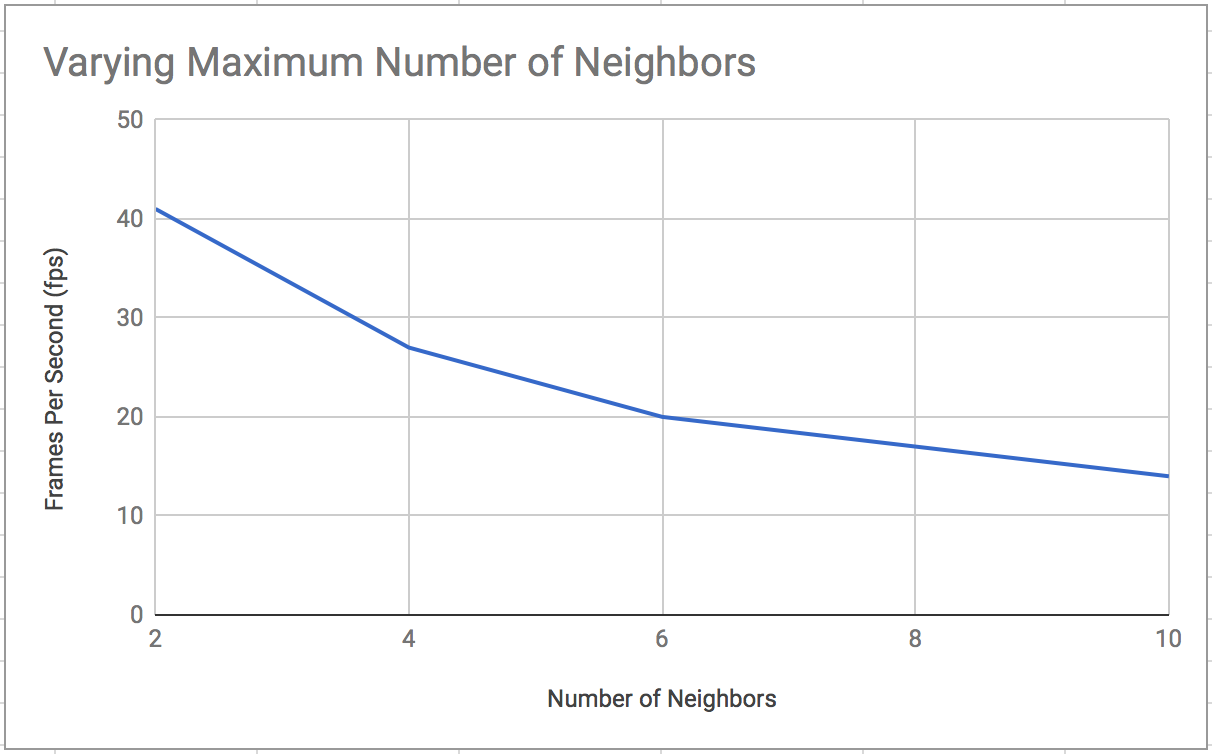 Increasing the maximum number of neighbors allowed per ball impacts performance. This happens because for every single addition to the maximum number of neighbors, balls hold 100 more particles.